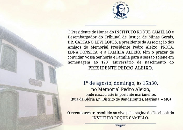 Hoje, 1º de agosto, às 15:30h, na Sede da Associação dos Amigos de Pedro Aleixo, situada na Rua da Glória, nº 362, distrito de Bandeirantes, será prestada uma homenagem alusiva aos 120 anos do nascimento deste Marianense Ilustre.