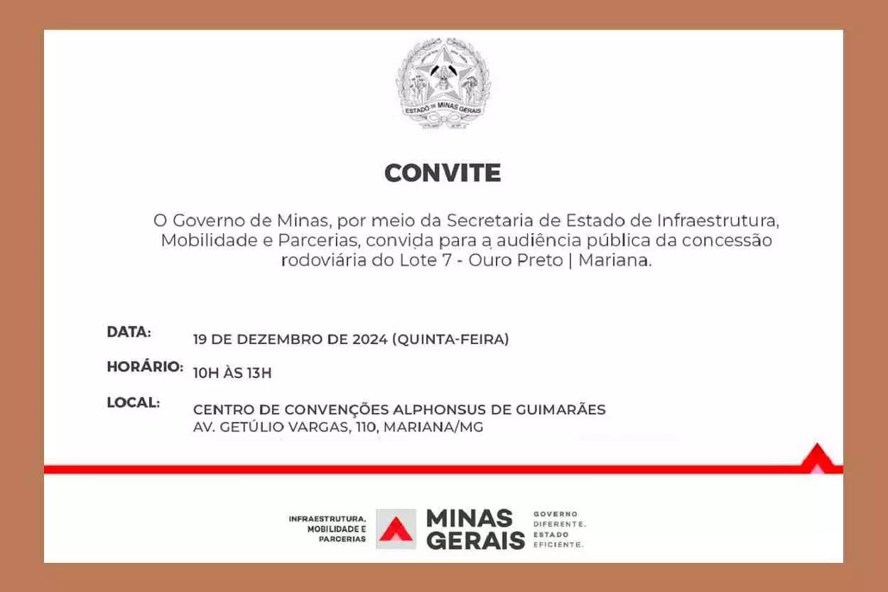 A audiência foi convocada pelo Governo de Minas Gerais, em publicação do Diário Oficial de Minas Gerais, edição nº 241, de 06/12/2024 - Imagem: Reprodução/SEINFRA