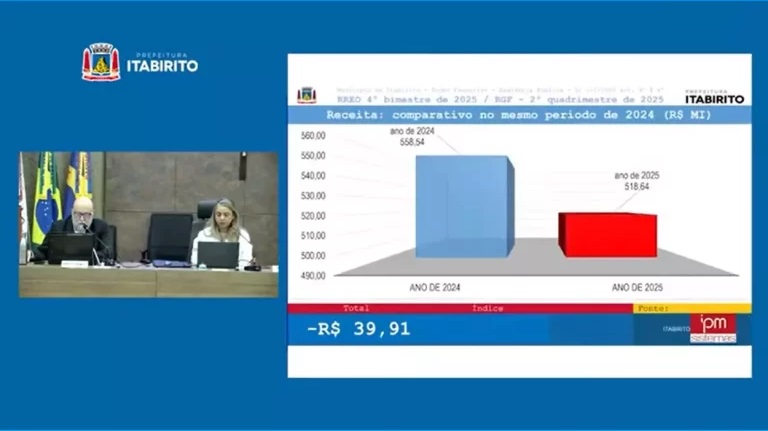 Em audiência pública realizada na última quinta-feira (23), a secretária de Fazenda e Tributação, Elisângela Lima, acompanhada do consultor de Finanças e Contabilidade, Luiz Tedo, apresentou os números relacionados ao desempenho orçamentário do município de Itabirito, relativo ao 2° quadrimestre de 2025, com recorte para o relatório de gestão fiscal dos dois últimos meses. De acordo com os relatórios, a arrecadação caiu, não somente em relação à previsão para 2025, como não conseguiu sequer atingir o patamar obtido no mesmo período do ano passado.