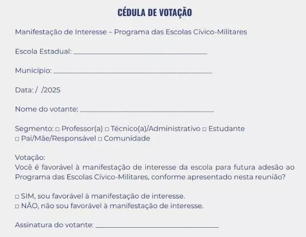 De acordo com o memorando enviado às escolas, o governo afirma que o processo deve ser conduzido “com responsabilidade, escuta ativa e pleno respeito à autonomia da comunidade escolar”. As decisões de adesão dependem da realização de assembleias com participação mínima de estudantes, famílias e servidores, conforme regras da Resolução SEE nº 5.065/2024.