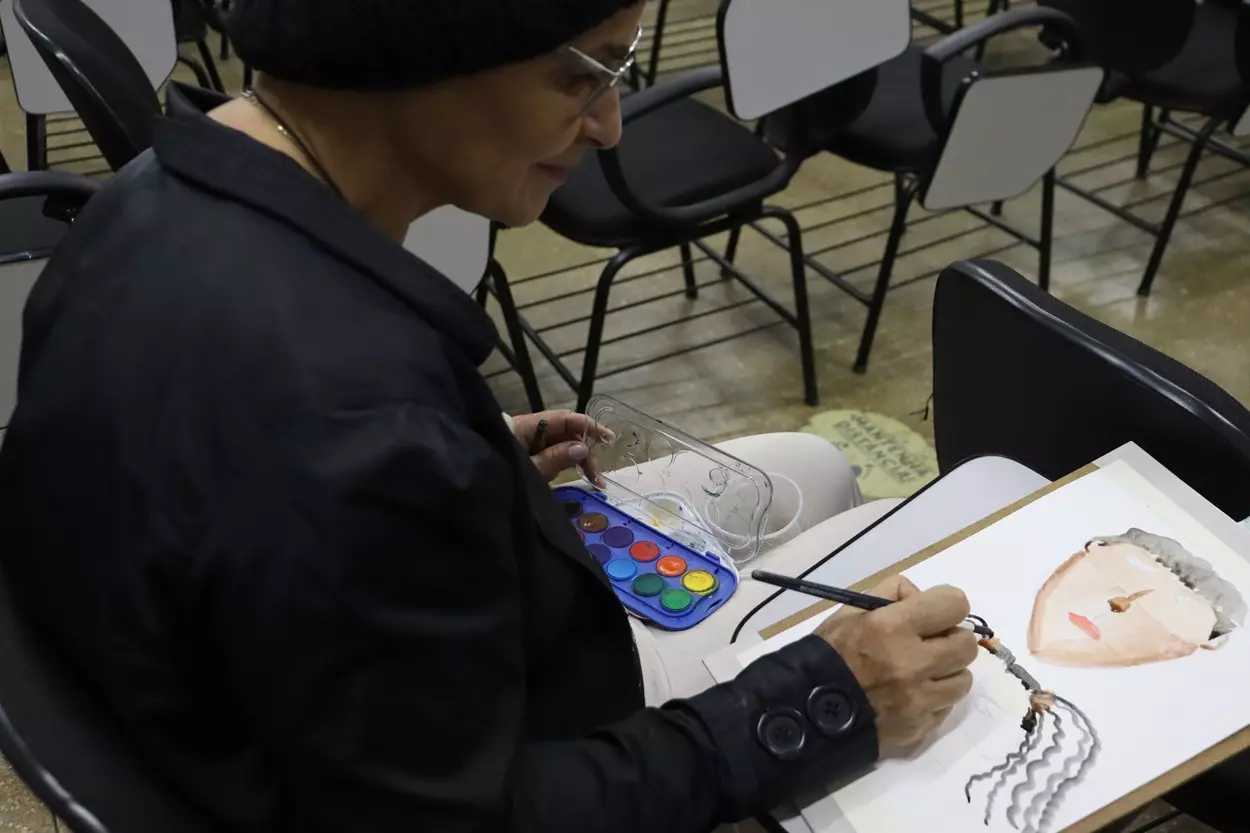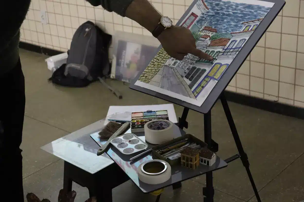 Além das mostras, André Perdigão, arquiteto urbanista e aluno do curso de alvenaria da Escola de Ofícios, mediou uma oficina de desenho e aquarela durante a feira. Ele ensinou teorias das cores e perspectiva e de como é feita a construção do desenho, compartilhando dicas de como fazer contraste, textura e iluminação. “O ofício do desenho tem que se tornar cada vez mais democrático, então eu propus a oficina como uma forma de democratizar essa atividade. Poder construir isso junto à escola, para mim, é muito gratificante”, comemora o artista.